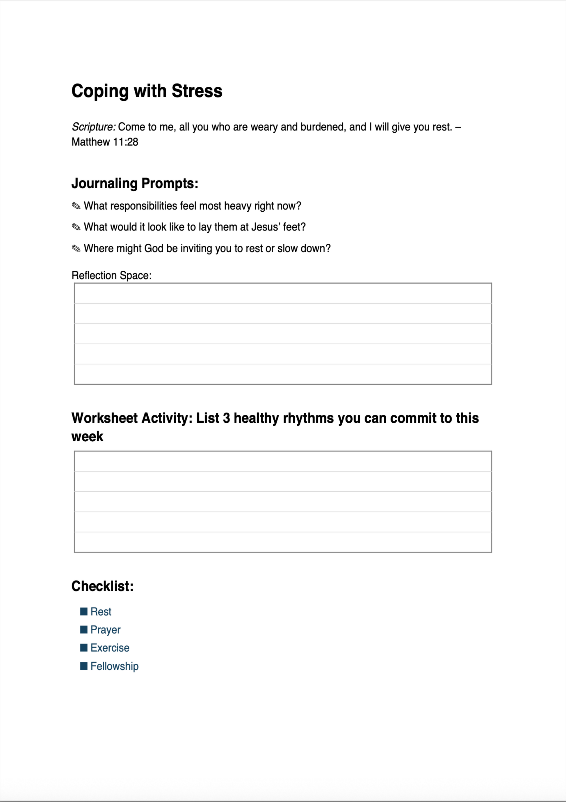 Worksheets & Checklists: Practical tools for building healthy rhythms and habits.